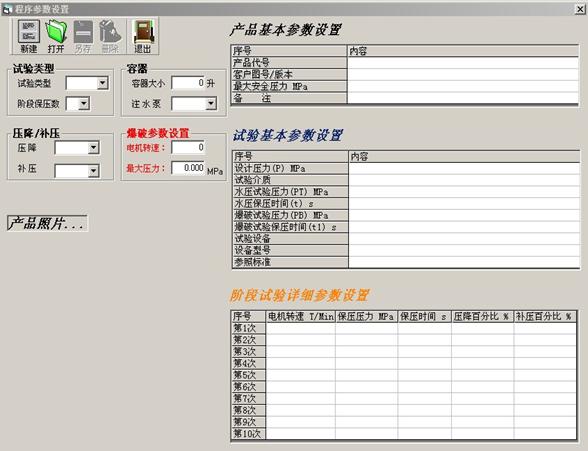 8、试验程序及参数预输入功能,可任意设定升压程序流程,按照被测试容器设定典型的试验程序有:恒速升压—保压—泄压;恒速升压—直至爆破。恒速升压—保压—恒速升压—保压—恒速升压直至达到试验标准压力;多段恒速升压保压试验过程(梯度升压,可程序选择阶段0-10段,或者更多段)--恒速升压直至达到试验标准压力;另外本软件可以任意设定疲劳测试功能,1-10万次。