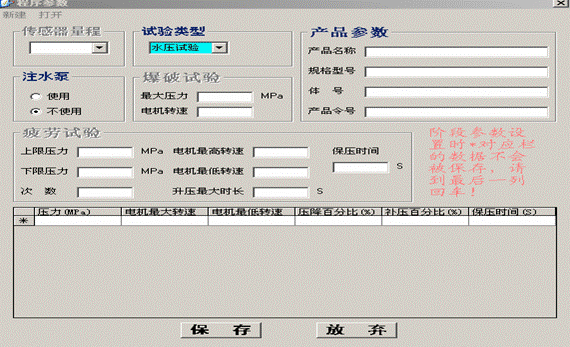 挑选实验类型,商品参数等。依据不一样实验类型,会有不一样参数需求装备。水压实验有必要填压力期间参数,爆炸实验假如需求期间镇压再爆炸也要填期间压力参数。压降百分比是指保压时刻内降低的压力超越设定百分比被以为不合格。补压百分比是指保压时刻内压力降低超越设定百分比,体系主动启动试压泵补压。