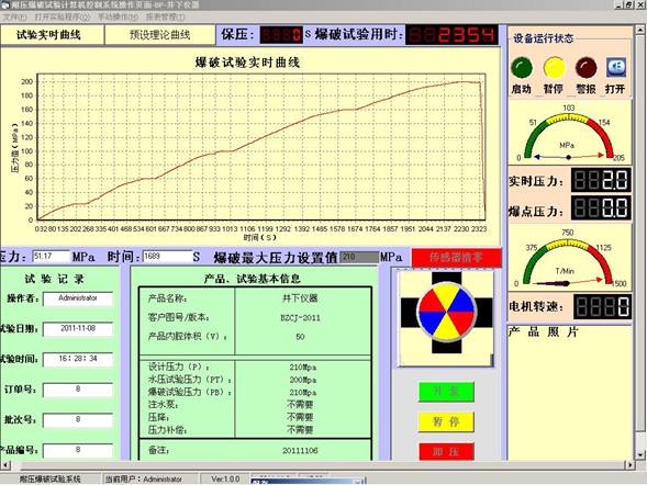 本系统内置本公司自主研发的专用控制软件,操作界面人性化,软件性能成熟稳定无缺陷,可以任意设定试验项目、压力值、保压时间等各种试验参数。完善的人机交互界面,制定试压方案后会通过弹出窗口的形式引导操作员完成实验。通过对话框上“确定”,“取消”按钮对相对危险(例如爆破实验)的试验项目,让程序员进行确认,确定实验的准确与安全。软件可根据用户技术要求更改功能,可按照用户自定义界面及功能编制,以双方最终沟通需方认可的界面为准。